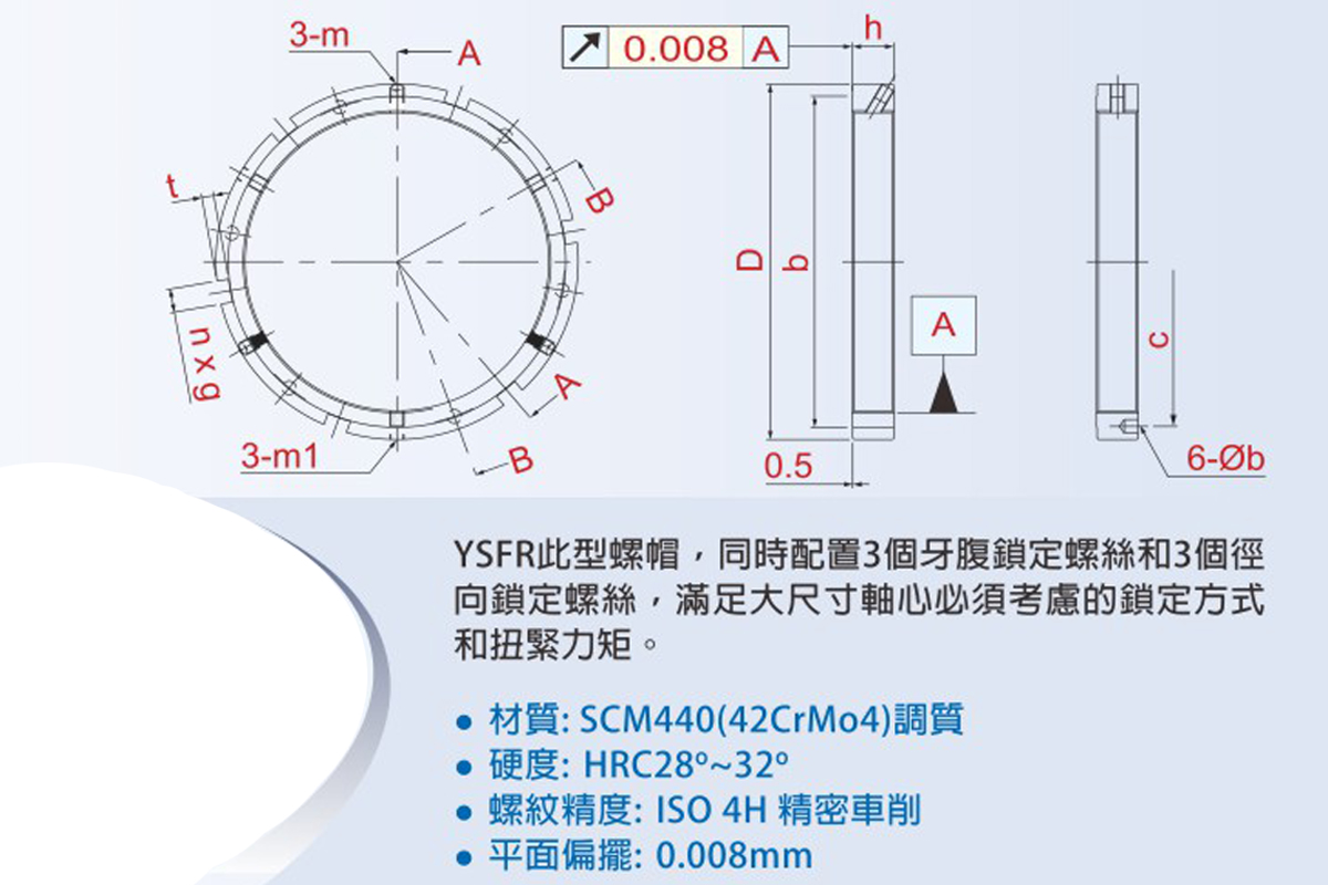 YSFR此型螺帽,同时配置3个牙腹锁定螺丝和3个径向锁定螺丝,满足大尺寸轴心必须考虑的锁定方式和扭紧力矩。